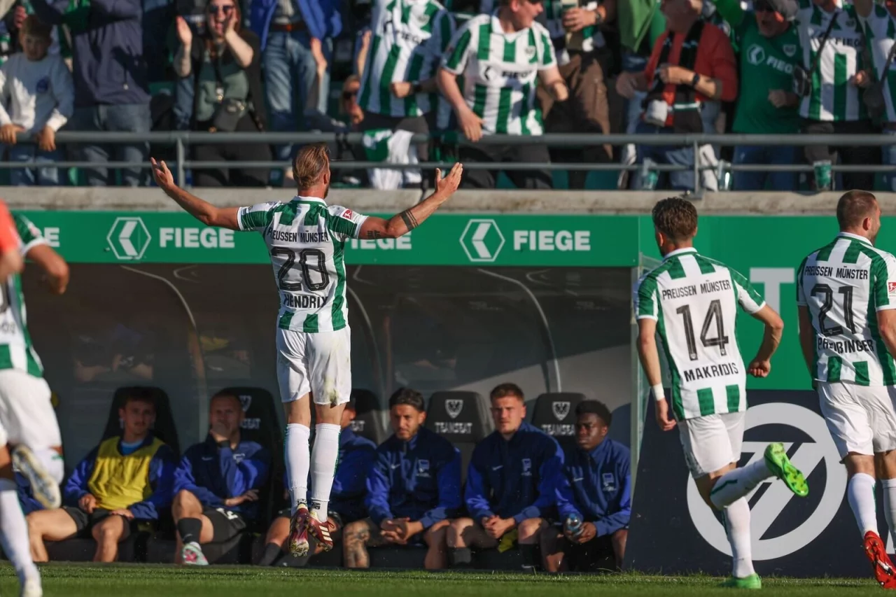 Jorrit Hendrix erzielte vor 12.422 Zuschauern im Preußenstadion beide Tore für die Westfalen. In der 30. Minute traf er mit der Hacke. Im zweiten Durchgang nach einem Einwurf per Kopf (70.).