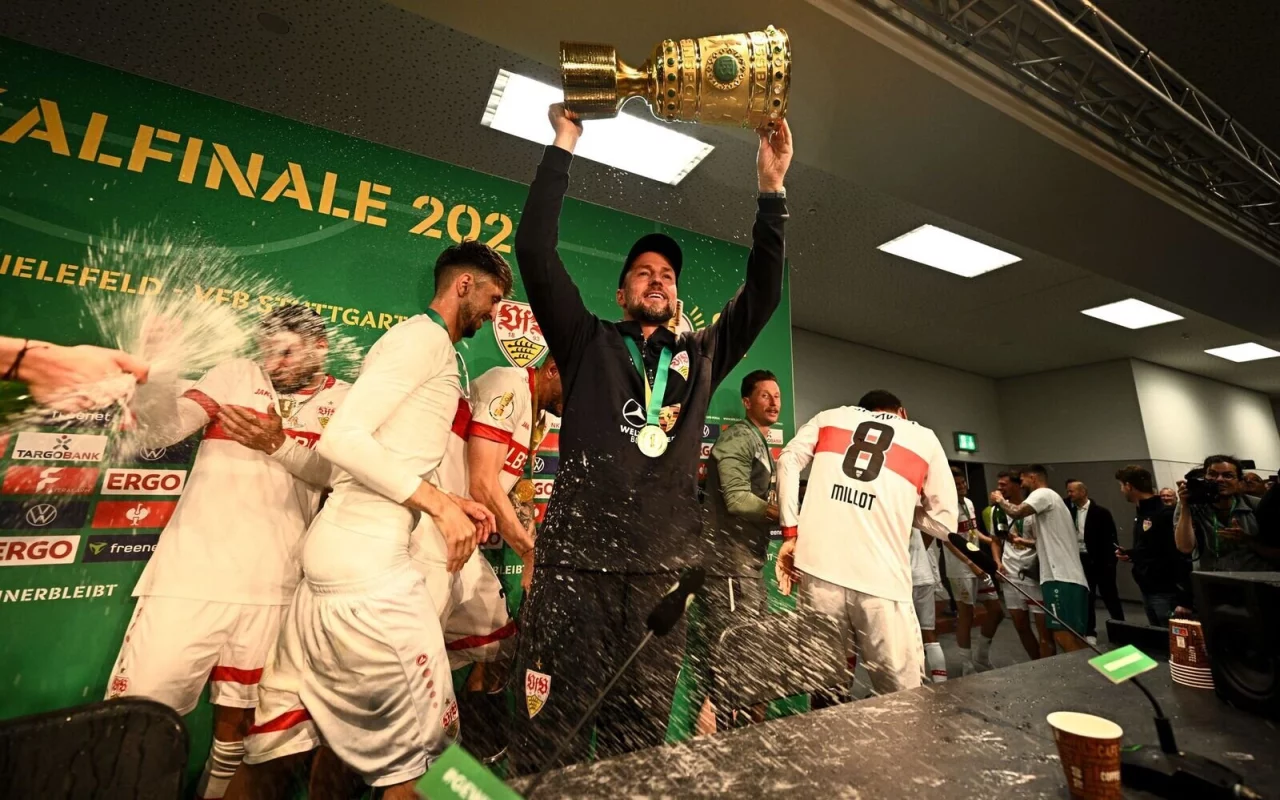 VfB-Kapitän Atakan Karazor trug den Pokal zu seinem Trainer. Mit dem Cup in der Hand und umringt von seinen Spielern verschwand Hoeneß in eine lange Party-Nacht.