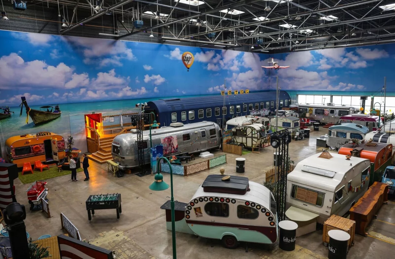 «Trocken-Camping» - so nennt es Thomas Lenz, Sprecher des Bonner Basecamp. In einer Halle stehen 13 Retro-Wohnwagen, vier massige US-Airstream-Reiseanhänger, zwei ausrangierte Schlafwagen der Bahn und eine alte Schweizer Berggondel.