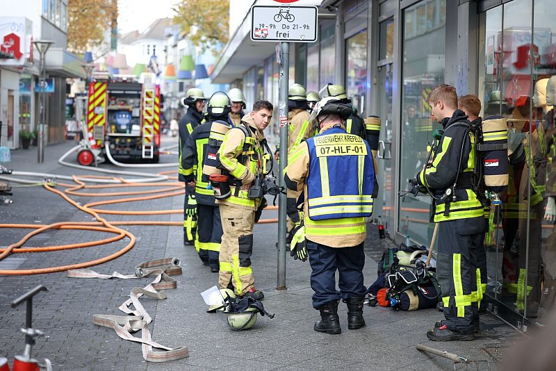 In der Krefelder Einkaufsmeile hat ein Feuer ein Geschäft verwüstet. «Das Erdgeschoss ist komplett zerstört», sagte ein Sprecher der Feuerwehr. Ob angrenzende Wohnungen beschädigt wurden, soll geprüft werden. Eine Frau ist nach seinen Informationen ins Krankenhaus gebracht worden. Nähere Informationen zu ihrem Gesundheitszustand lagen zunächst nicht vor. Insgesamt sechs Betroffene habe der Rettungsdienst gesichtet.