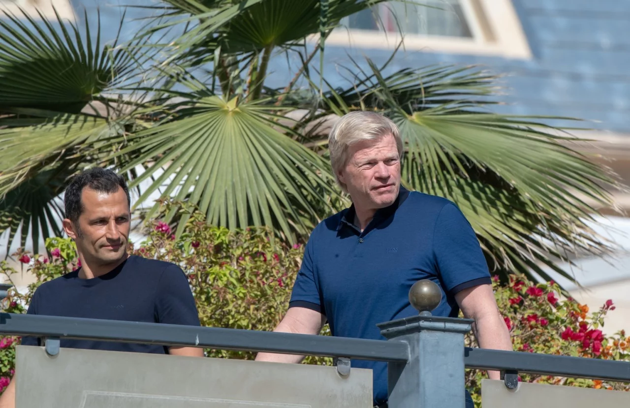 Nach dem Frühstück und einem ersten Gespräch mit Sportdirektor Hasan Salihamidzic schaute Kahn überwiegend unter einem Sonnenzelt sitzend dem Team um Kapitän Manuel Neuer bei der schweißtreibenden Vormittagseinheit mit harter Konditionsarbeit zu. Auch Hansi Flick gesellte sich für einen kurzen Plausch zum Bayern-Chef der Zukunft.