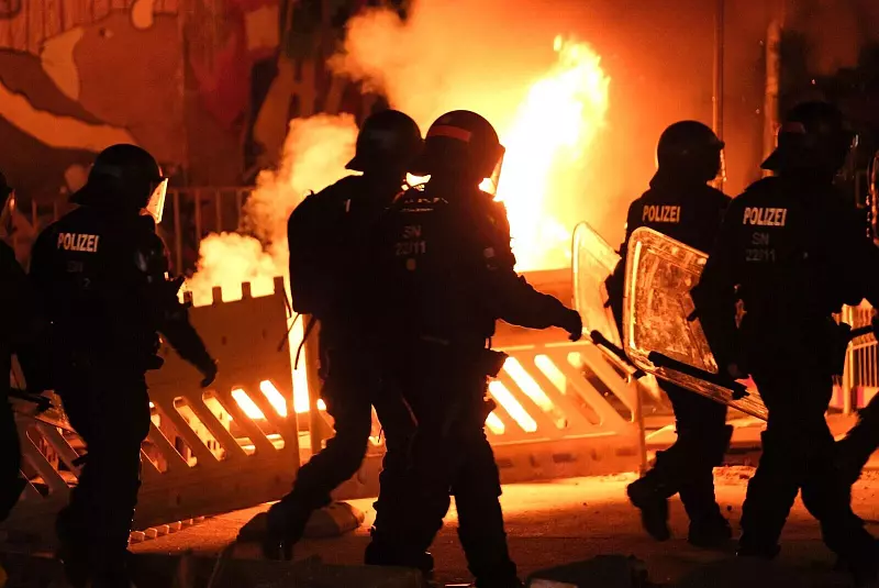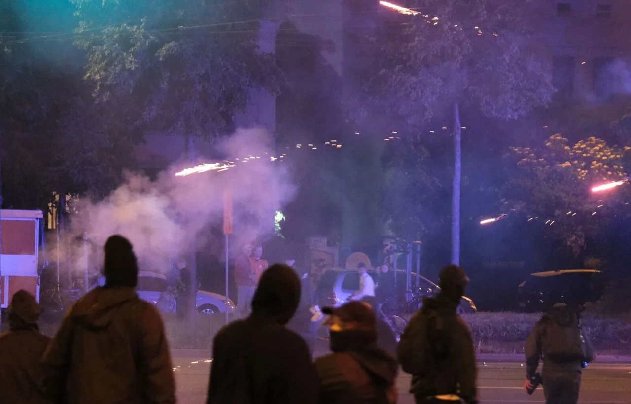 Am Freitagabend hatten Vermummte Polizisten angegriffen. Nach dem zunächst friedlichen Verlauf einer Versammlung am Wiedebachplatz im Stadtteil Connewitz wurden aus einer Menge von bis zu 700 Vermummten heraus Steine geworfen und Pyrotechnik gezündet. Sowohl dort als auch in Nebenstraßen brannten Barrikaden aus Mülltonnen und Baustellenabsperrungen. Die Polizei setzte Tränengas ein und wurde nach eigenen Angaben von Hausdächern mit Gegenständen beworfen.