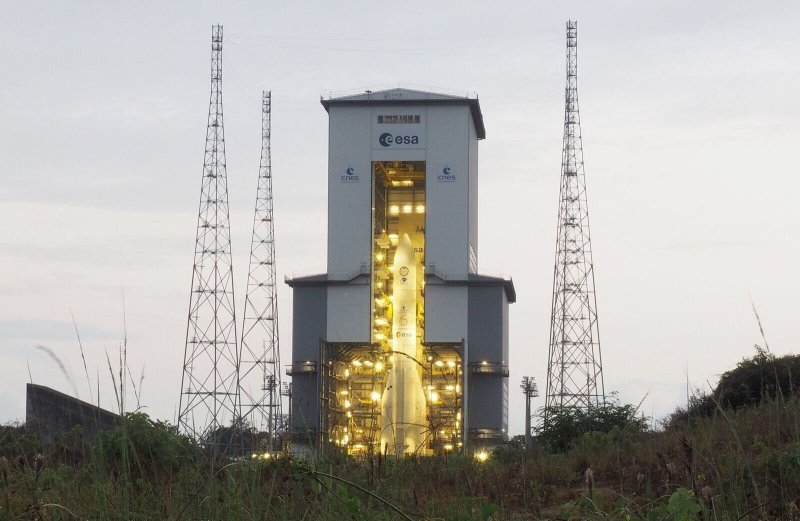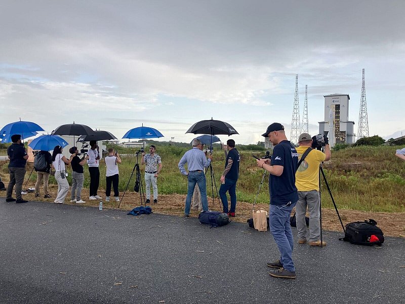 Das Wetter sah am Starttag vielversprechend aus. Es könne zwar regnen, aber das mache nichts, erklärte die Esa. Das mobile Arbeitsgerüst, das lange Zeit um die Ariane 6 herum stand, wurde weggezogen, um die Rakete freizulegen. Das Gerüstgebäude ist 90 Meter hoch und 8200 Tonnen schwer. Es wurde auf Schienen rund 140 Meter weit weggerollt.