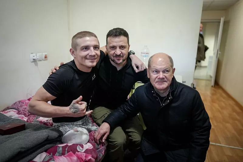 Scholz kam am Morgen nach gut neunstündiger Fahrt mit einem Sonderzug aus Polen in Kiew an. Zusammen mit dem ukrainischen Präsidenten Wolodymyr Selenskyj besuchte er dort zunächst verwundete Soldaten in einem Krankenhaus, darunter auch einige, die Gliedmaßen verloren haben.