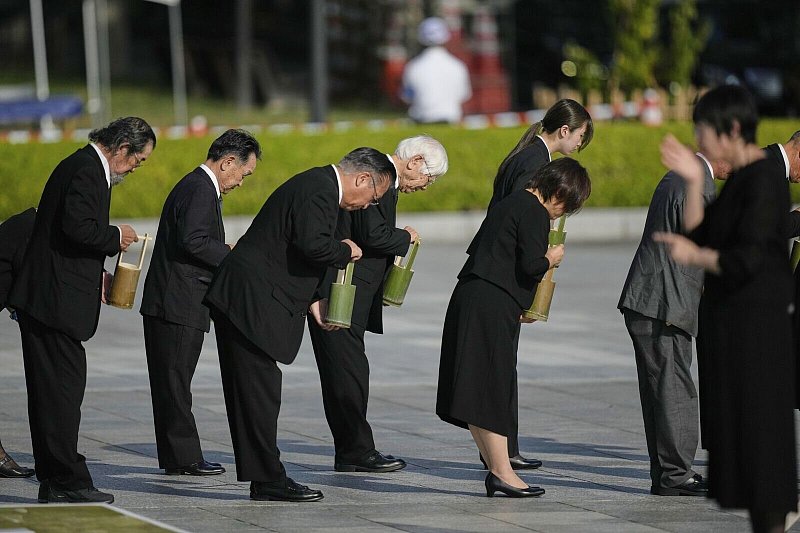 Teilnehmer der Gedenkveranstaltung in Hiroshima halten eine Schweigeminute ab. - © Louise Delmotte/AP/dpa