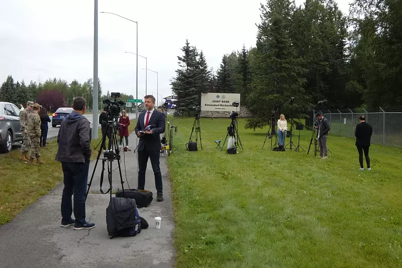 Der Ort des geplanten Treffens ist der US-Militärstützpunkt Elmendorf-Richardson. Eine Straße etwas außerhalb der größten Stadt Alaskas führt zum Eingang des umzäunten Geländes. Eine abgetragene blaue Linie auf dem Asphalt zeigt an, bis wohin die Pressevertreter sich positionieren dürfen. Bis ganz zur großen Einfahrt dürfen sie nicht vor.