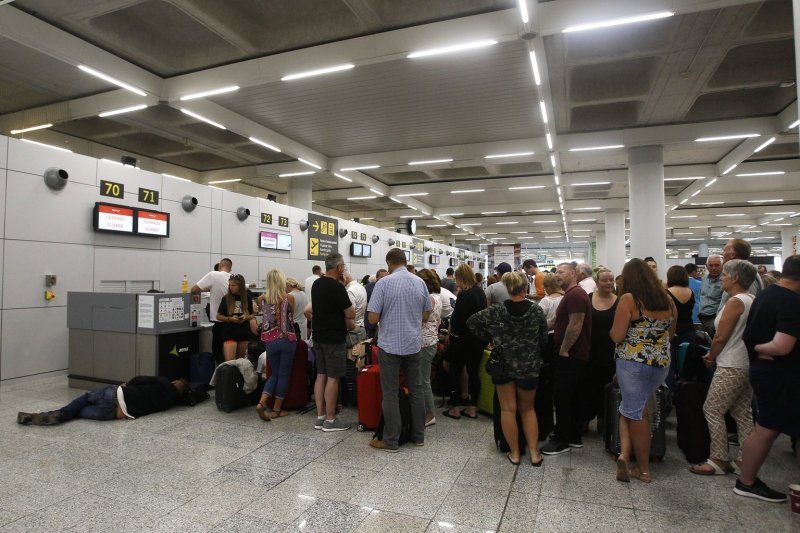 Gestrandete Urlauber stehen in einer Schlange am Flughafen von Palma de Mallorca. (© Foto: Isaac Buj/Europa Press)