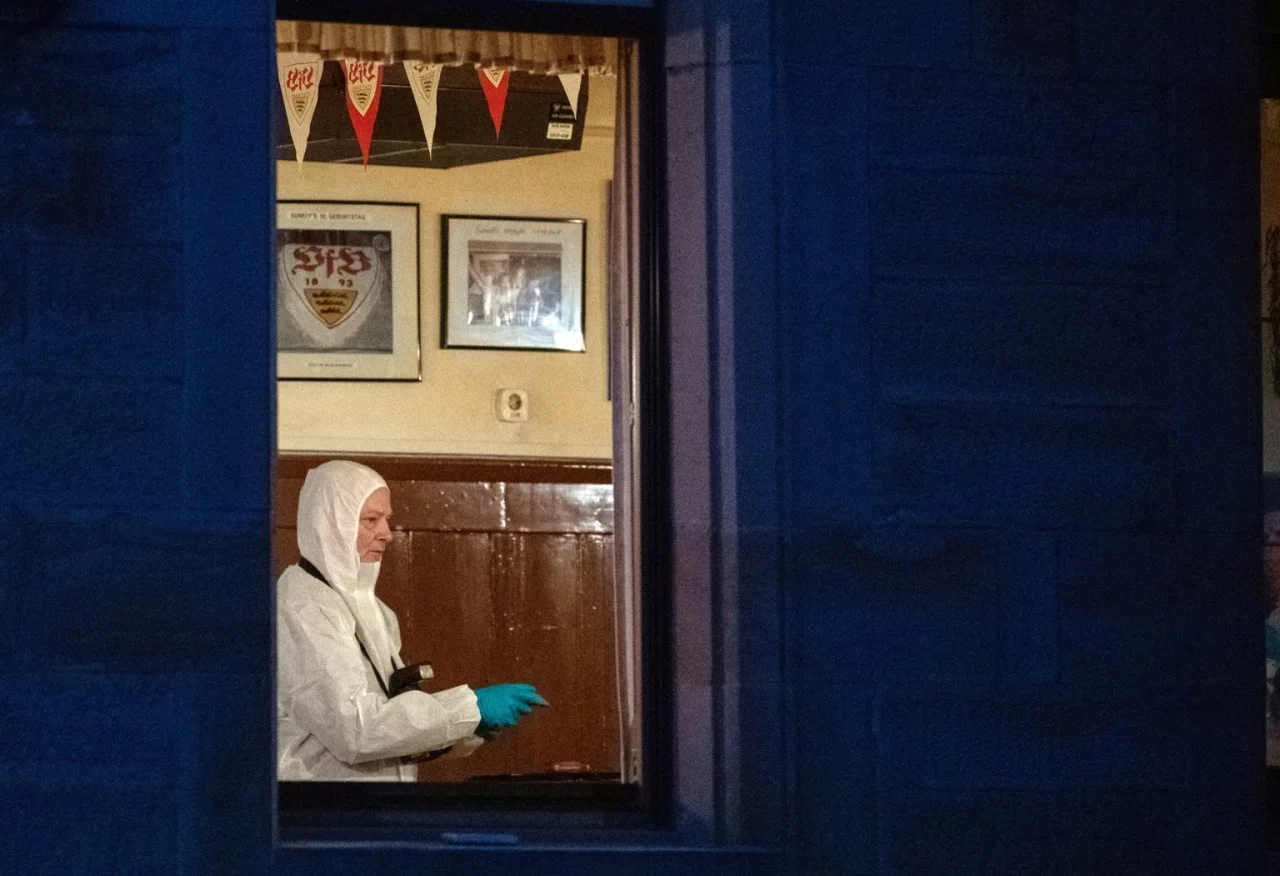 Vor der Gaststätte stehen rund ein Dutzend uniformierte Polizisten und pusten sich die Kälte aus den Händen. Spurensicherer in weißen Anzügen gehen in die Kneipe. Vor dem Haus sprühen Beamte gelbe Striche auf die Straße. Auf einem Fenstersims der Gaststätte liegt ein Telefon, das ab und an laut klingelt. Das Telefon des mutmaßlichen Schützen?