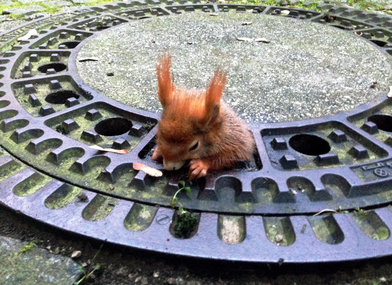Zu breite Hüften: Eichhörnchen steckt in Gullydeckel fest