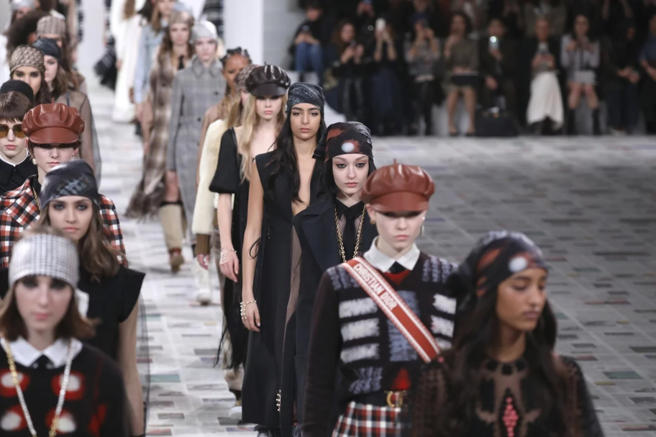 Chiuri machte ihre feministischen Botschaften auch in den Entwürfen deutlich, die von maskulinen Elementen geprägt waren. Eröffnet wurde die Show von einem schwarzen, schmal geschnittenen Anzug, den Model Ruth Bell mit raspelkurzen Haaren und kurzem Schlips trug. Danach folgten Pullunder über weißen Hemden und weiten Anzughosen, zweireihige Blazer und große Karomuster.