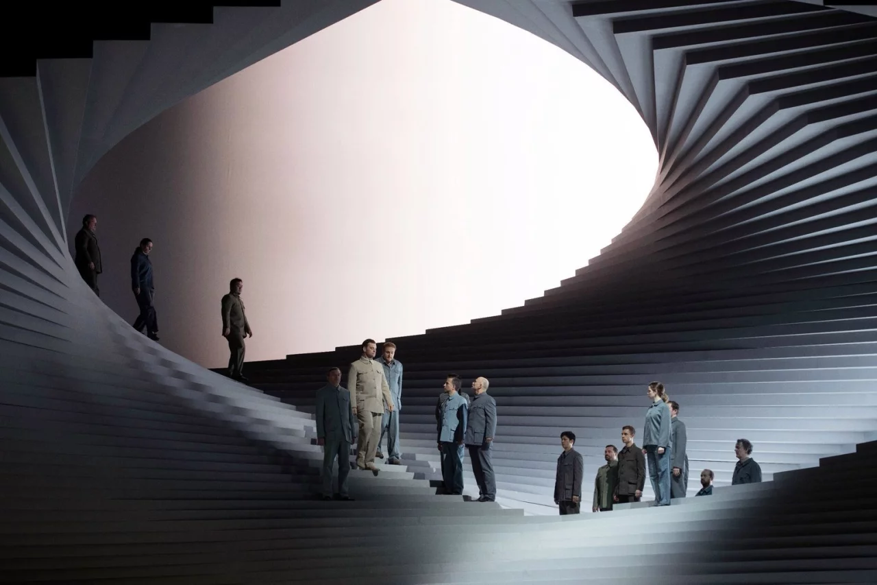 Das Treppen-Bühnenbild des deutsch-amerikanischen Architekturbüros Barkow Leibinger sorgte für einen flexiblen und doch neutralen Hintergrund, der verdeutlichte, dass politisches Unrecht überall auf der Welt geschieht. Das Spannungsfeld Gefangenschaft und Freiheit gab dem Stück angesichts der weitreichenden Maßnahmen zur Eindämmung der Coronavirus-Pandemie auch noch die aktuelle Tragweite.