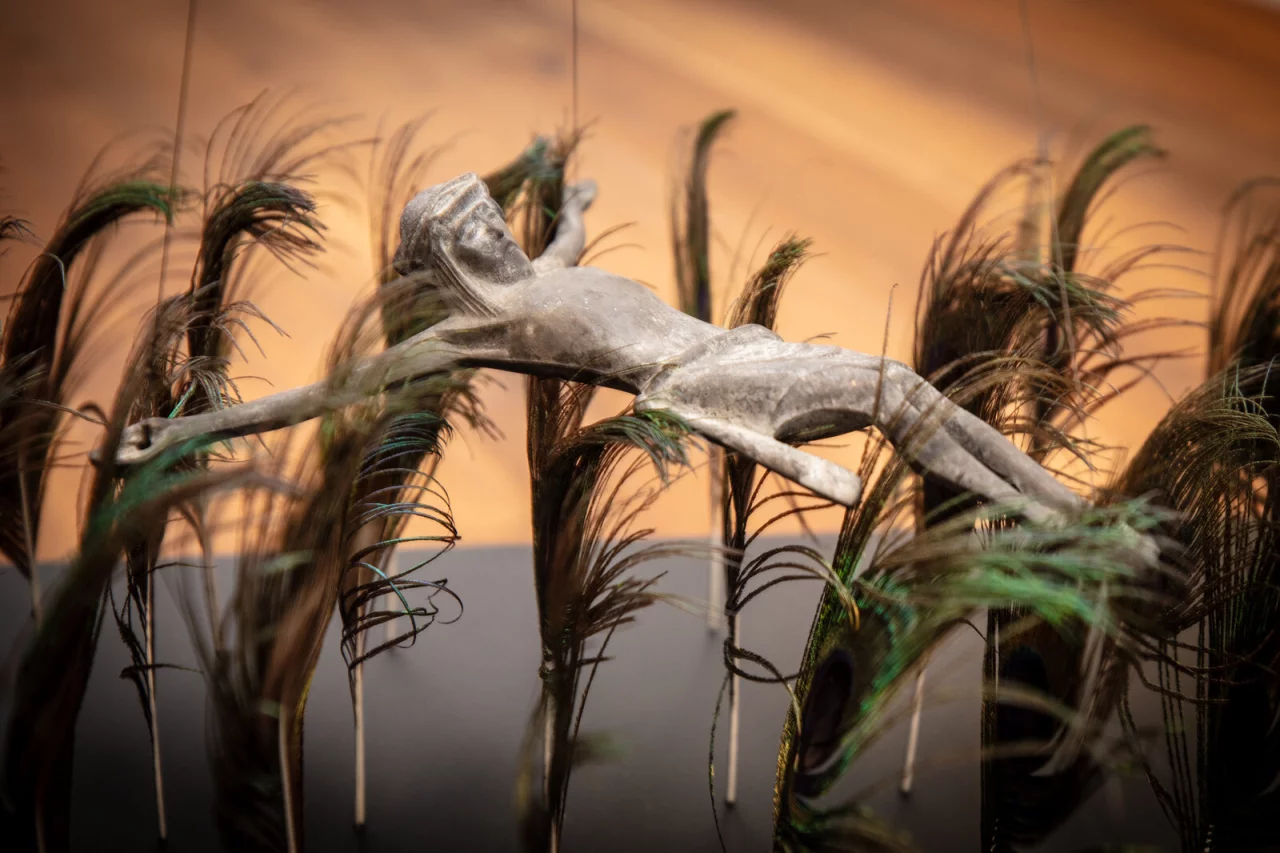 Auffällig ist: Die Kunst aus OWL steht mittendrin im Leben, nicht abseits, und ist stark gegenwartsbezogen. Die großen Themen unserer Zeit, Klimakrise, Umweltzerstörung, Nachhaltigkeit, Vereinzelung, Unbehaustheit des modernen Menschen, Geschlechteridentitäten finden sich in Malerei, Skulptur, Installationen, Fotografien, Collagen und Film wieder. Es ist eine Freude, sich den verschiedenen Räumen, die den jeweiligen Verbänden zugeordnet wurden, zu nähern und sich in ihnen zu verlieren. Überschrieben sind die Kabinette mit Oberthemen wie zum Beispiel „Mensch im Zentrum“ oder „Kosmos, Welt, Stadt, Land, Natur“. Das Künstlerinnenforum hat zudem einen Raum nur mit Arbeiten im Format 40 mal 40 Zentimeter gestaltet. Eine Beschränkung, die dennoch zu vielfältigen Werken führt. In einem anderen Raum zeigt deren Untergruppe „Pentimenti“ Bilder, die ihre Mitglieder einst liegen ließen und nun übermalt haben.
