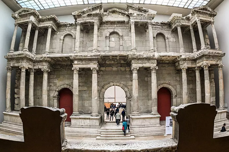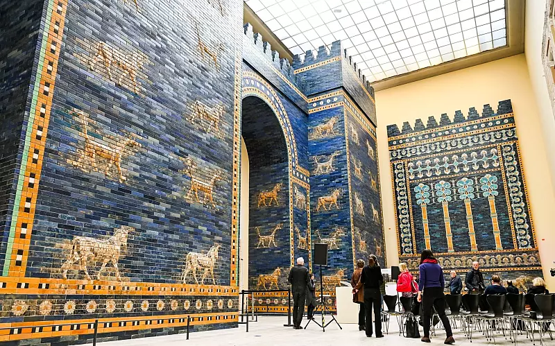 In den weitgehend leeren Räumen des Südflügels sind Architekturexponate wie die Prozessionsstraße von Babylon, das Ischtar-Tor und das Markttor von Milet zu sehen.
