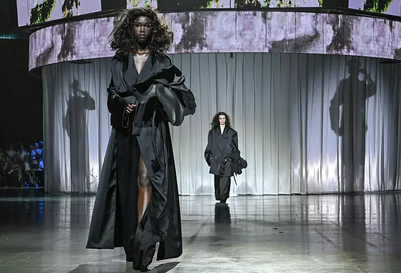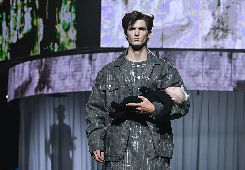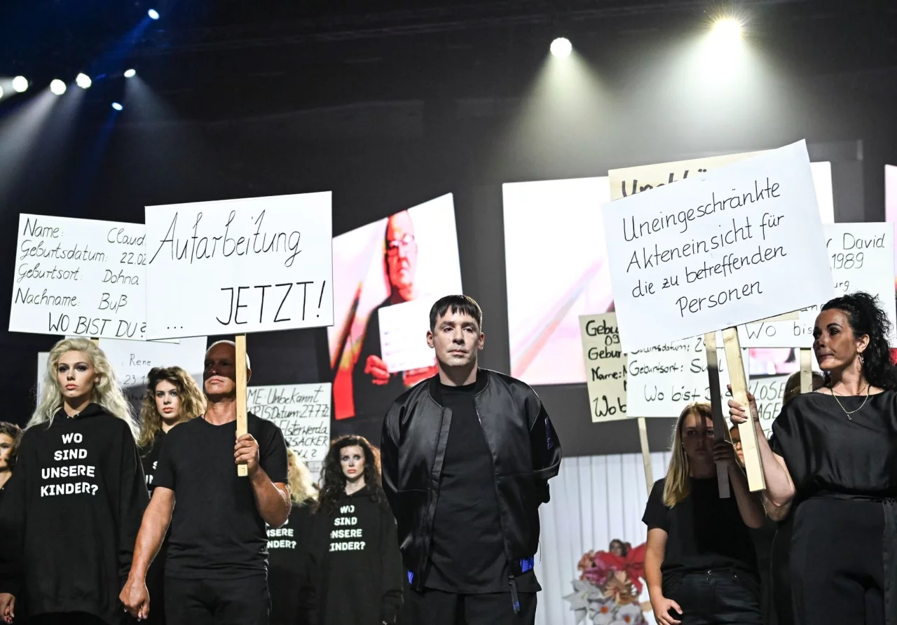 Dabei war aber auch ein männliches Model in einem groben grauen Anzug mit Babypuppe im Arm. Zum Ende hin marschierten die Models in Kapuzenpullis mit der Aufschrift «Wo sind unsere Kinder?» und handgeschriebenen Demoplakaten auf. «Wo bist du?», fragte eines. «Aufarbeitung jetzt!», forderte ein anderes.