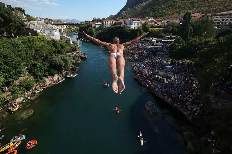 Die Sprünge von der legendären Brücke in den eiskalten Bergfluss Neretva, der die Kleinstadt Mostar in Bosnien-Herzegowina teilt, sind längst Touristenattraktion. Dieser Sport mit langer Tradition ist nur etwas für Trainierte, denn er ist riskant: Von dem fast 30 Meter hohen Scheitelpunkt der nach oben gebogenen Brücke gilt es, die Wasseroberfläche in möglichst senkrechter Körperposition zu erreichen - besondere Könner schaffen Kopfsprünge. In der Regel finden die Sprung-Events in organisierter Form, oft als Wettbewerb statt.