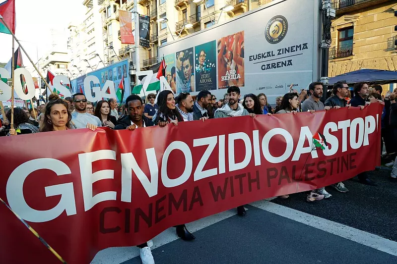 Teilnehmer trugen ein Transparent mit der Aufschrift «Stop Genocide. Cinema with Palestine» auf Baskisch und Englisch. Manchen riefen Parolen wie «Das ist kein Krieg, das ist ein Völkermord» oder «Boykott gegen Israel».