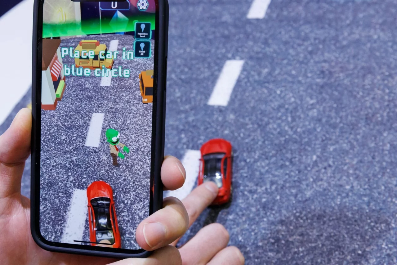 Noch steht das Spielzeugauto auf einem Tisch herum. Doch kurz darauf wird es zum Protagonisten in einem Computerspiel. Dafür hält Tony Nitschke sein Smartphone über den roten Wagen - und dieser erscheint in einer Straßenszene, in der neben Autos auch Zombies herumflitzen. Nitschke schubst das reale Auto auf dem Tisch vor sich an - und trifft im Spiel einen Zombie.