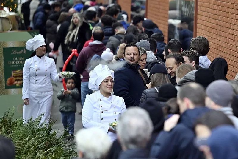 Mitarbeiterinnen mit Chocolatier-Mützen vertrieben den Wartenden die Zeit mit kleinen Schoko-Geschenken. Die Tafeln gingen für umgerechnet mehr als 15 Euro über den Ladentisch. Die Dubai-Schokolade soll nun auch in den Großhandel gehen.
