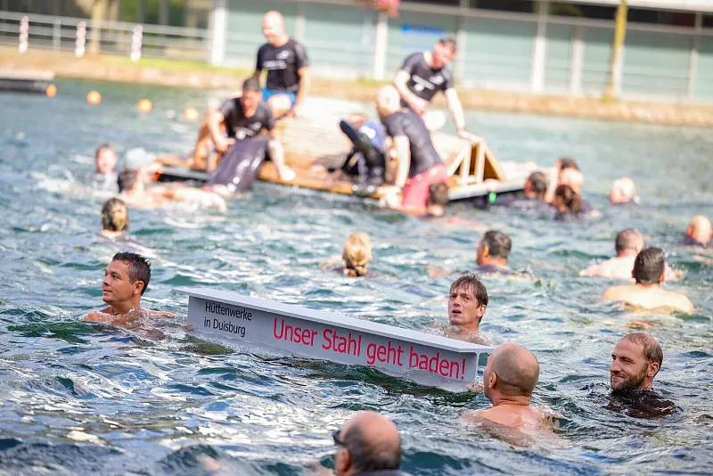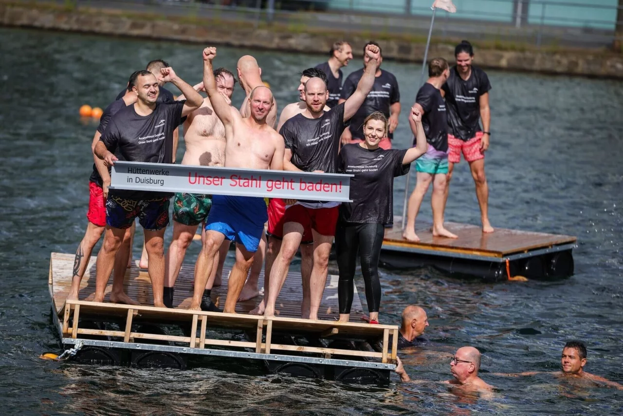 Mit einer spektakulären Aktion im Duisburger Innenhafen haben Beschäftigte des Stahlkonzerns Arcelormittal für den Erhalt ihrer Arbeitsplätze demonstriert und Investitionen in den Duisburger Standort gefordert. Unter dem Motto «Unser Stahl geht baden» sprangen rund 60 Stahlarbeiter von der Kaimauer ins Hafenbecken. An einer parallelen Kundgebung nahmen nach Angaben der IG Metall mehr als 550 Beschäftigte teil, darunter auch Mitarbeiter der Stahlunternehmen HKM und Thyssenkrupp Steel. Arcelormittal stellt in Duisburg unter anderem Draht für die Autoindustrie und den Maschinenbau her und beschäftigt laut IG Metall rund 850 Menschen.