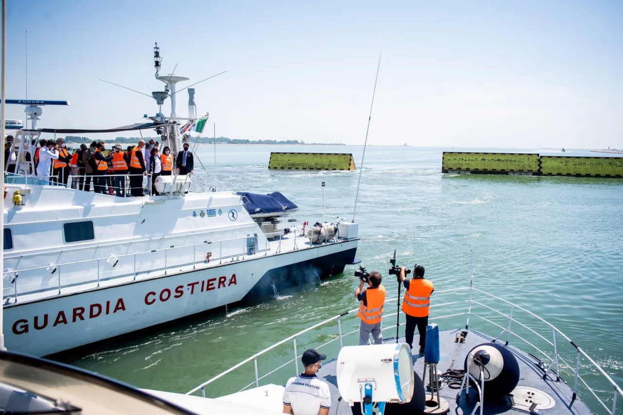 Heute wurde das Projekt erstmals komplett getestet und fast 80 mobile Flutschutzbarrieren wurden an drei Laguneneingängen ausgefahren. Es ist ein symbolischer Moment für Venedig. Entsprechend groß war das Aufgebot an Politikern. Selbst Regierungschef Giuseppe Conte kam, um den Test im Kontrollraum zu eröffnen.