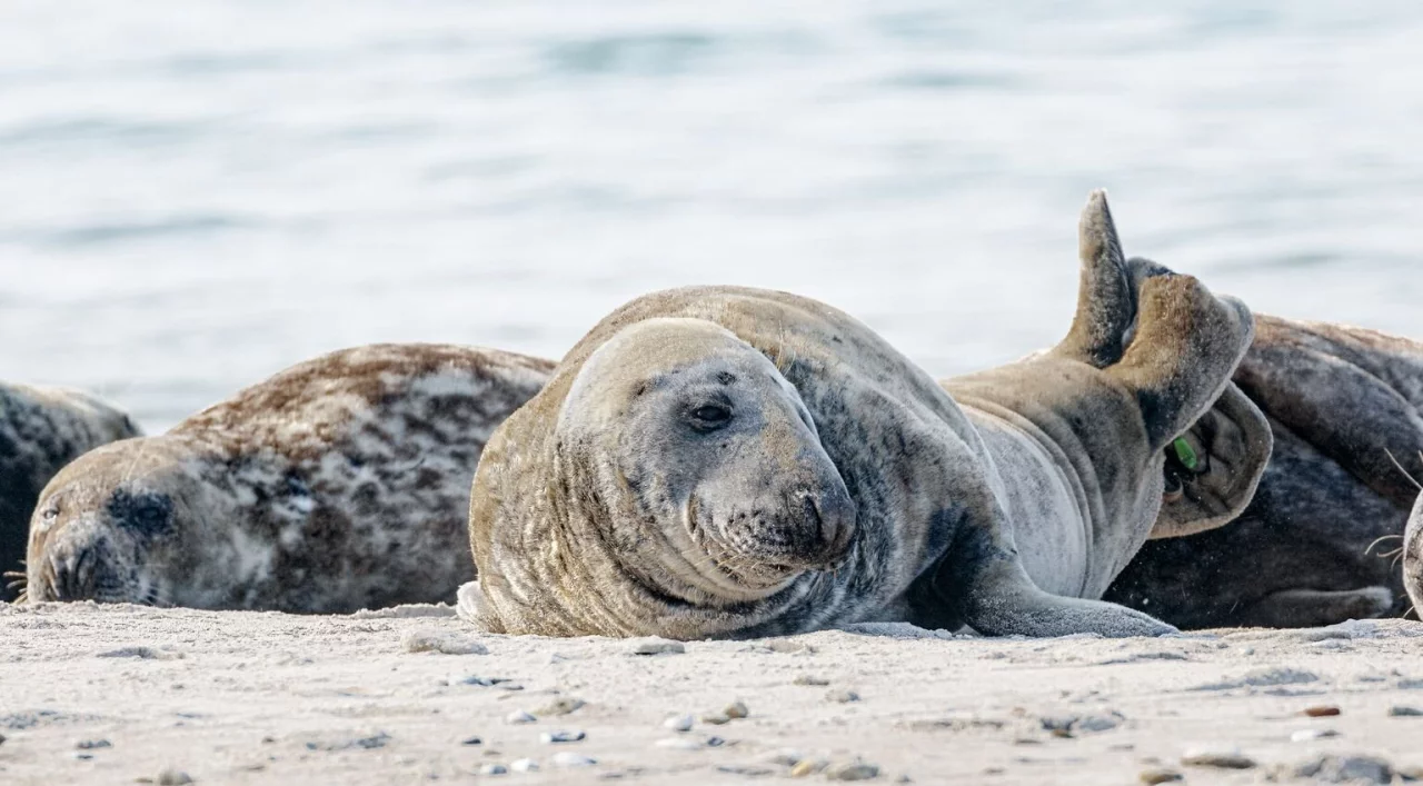 An diesem sonnigen Nachmittag sind es allein 800 Tiere am Nordstrand der Düne. Ein etwa 300 Kilogramm schwerer Bulle hebt den Kopf, die Rangerin beobachtet ihn durch ein Fernglas. Der Fellwechsel habe bei ihm gerade erst angefangen, erklärt die 60-Jährige. «Um die Augen rum und auf der Stirn sieht man schon etwas helleres Fell, glänzender.» Der Rest sei gelblich-hellbräunlich. «Das ist noch das alte Fell - abgenutzt und stumpf.» Das Fell wird durch das Leben im Salzwasser und an Land sehr beansprucht.