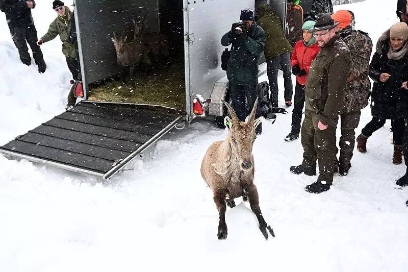 Dort warteten bereits Traktoren mit Schneeketten, um die Tiere zur Auswilderung auf die verschneite rund 1800 Meter hohe Benediktenwand zu bringen. Schneeregen dürfte ihnen die Eingewöhnung ohne Störungen durch Bergwanderer oder Gleitschirmflieger in den kommenden Tagen erleichtern. Das Projekt zeige, dass «Jägerinnen und Jäger auch Heger und Naturschützer sind», sagte Morlang. Das Steinwild unterliege dem Jagdrecht, werde aber ganzjährig geschont.