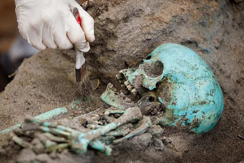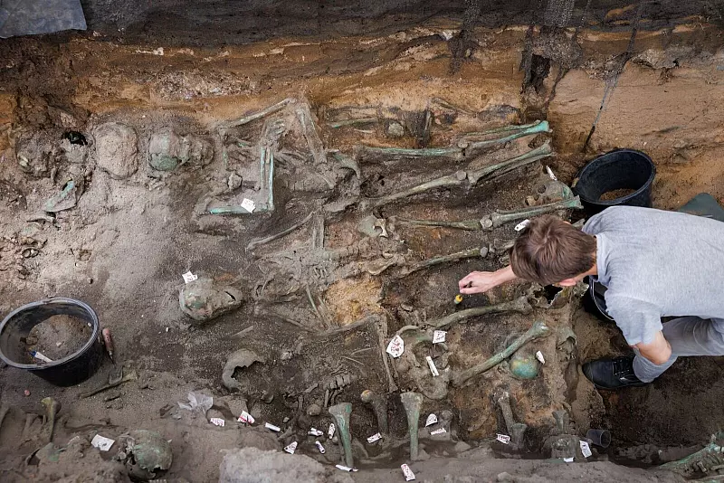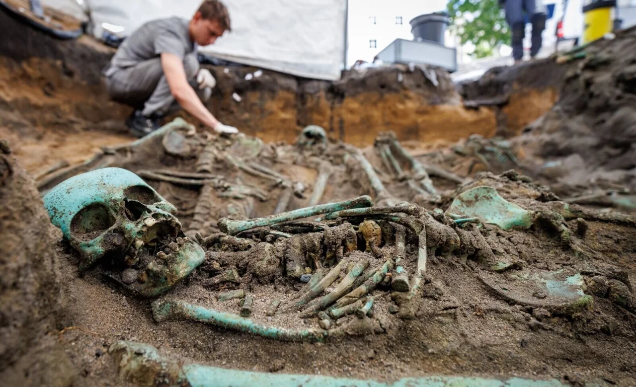 Diese Zahl sei schon sehr überraschend, sagt Langbein. Die Toten liegen ihr zufolge in vielen Schichten übereinander. Bis zu eineinhalb Meter tief müssen sich die Fachleute in die Erde graben, um die Knochen vorsichtig freizulegen. Diese sind grün verfärbt, weil eine Kupfermühle früher auf dem Grundstück Abfälle entsorgt hatte.