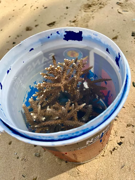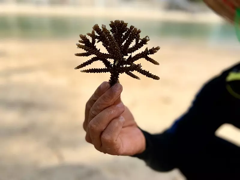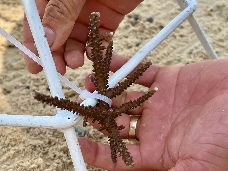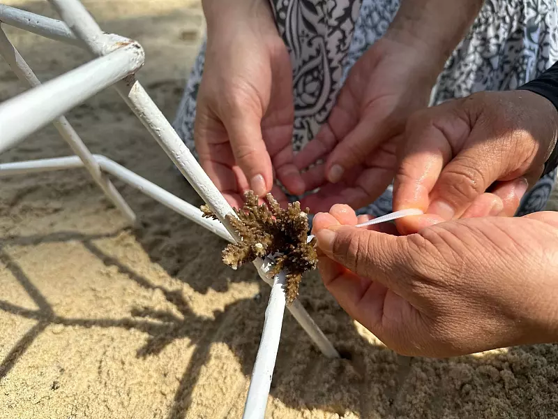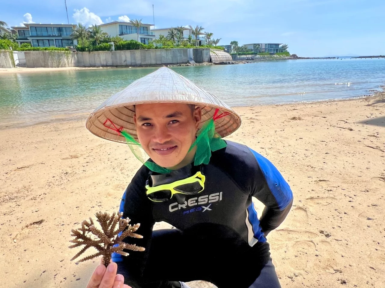 «Gaaanz vorsichtig», sagt Tran Van Chuong und legt einer Touristin eine kleine braune Koralle mit zierlichen weißen Spitzen in die Hände. Im Taucheranzug kniet er mit ihr im seichten Wasser nahe dem vietnamesischen Urlaubsort Nha Trang vor einem weißen Metallgestell. An jedem Bindeglied wird ein Fragment der Spezies Acropora muricata angebracht - ganz vorsichtig. Die Urlauberin bringt sie behutsam in Position, dann befestigt Chuong die fragilen Nesseltiere sanft mit Kabelbinder. «Korallen sind extrem empfindlich», weiß er.