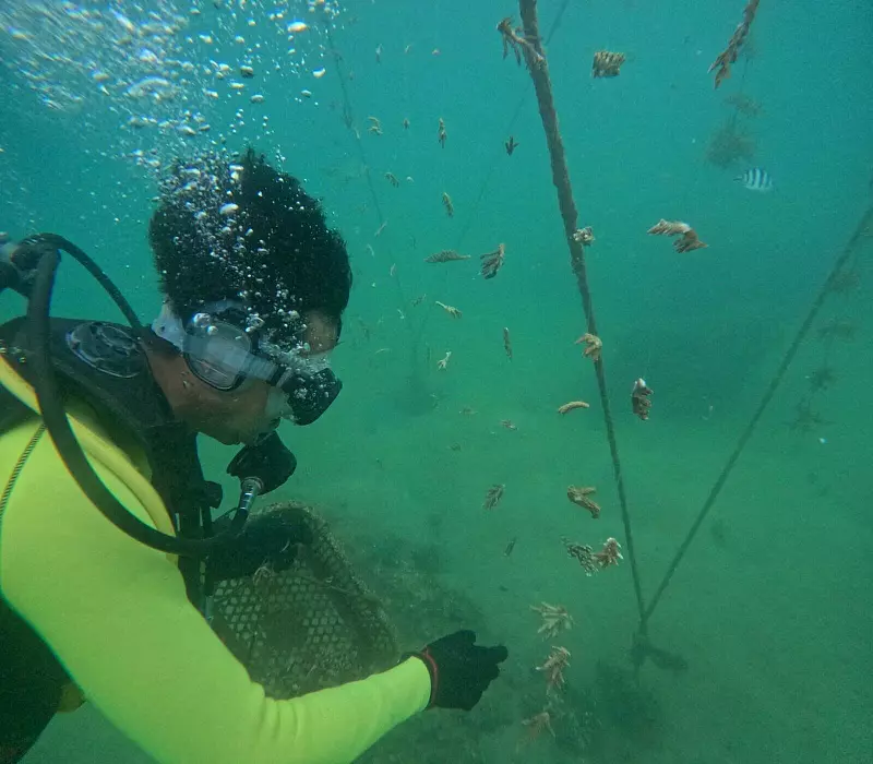 Das Unternehmen nutzt zwei verschiedene Wege, um neue Korallen aufzuziehen: Zum einen Gestelle, die Touristen sowohl in der Bucht als auch vor einer nahegelegenen Insel selbst im Meer platzieren können. Zum anderen Schnüre, an denen Bruchstücke besonders widerstandsfähiger und schnell wachsender Korallenarten in einigen Metern Meerestiefe angebracht werden. Eine Unterwasser-Aufzuchtstation oder, wenn man so will, eine Art Korallen-Baumschule.