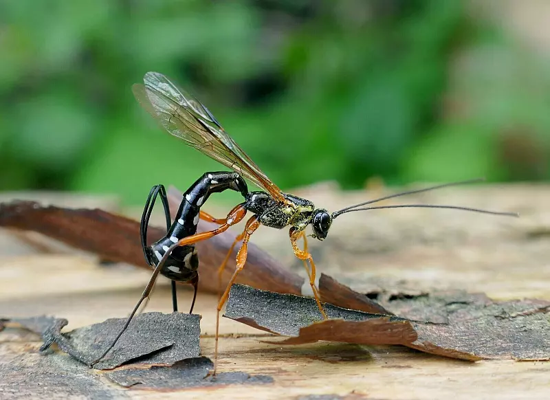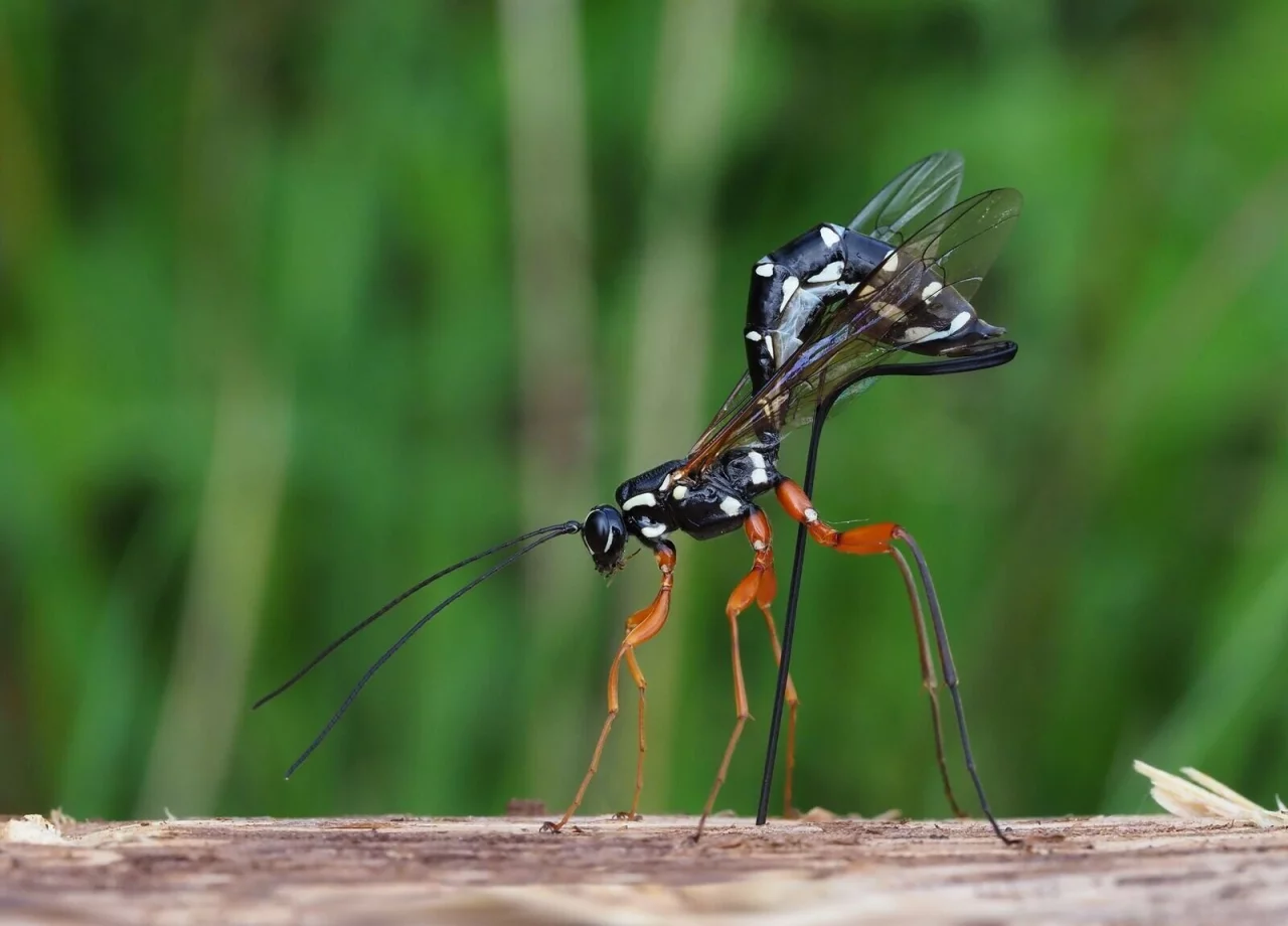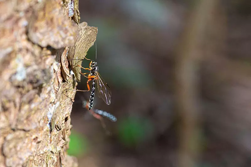 Die Holzwespen-Schlupfwespe wird etwa 35 Millimeter lang, hat rot-schwarze Beine, einen dunklen Körper mit weißen Tupfen - und erstaunliche Fähigkeiten: «Rhyssa persuasoria erkennt die von Holzwespen befallenen Bäume erstaunlicherweise am Geruch», erklärte der Insektenexperte. Sie rieche zwar nicht die Wespenlarve selbst, dafür aber die von ihr mitgebrachten Pilze, mit deren Hilfe das Holz verdaut werden kann.