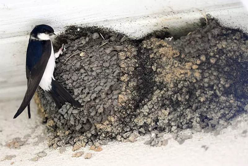 Mehlschwalben mit ihrer weiß leuchtenden Unterseite bringen ihre Nester dagegen gerne außen an Gebäuden an. Mit ihnen ist ab Ende April zu rechnen.