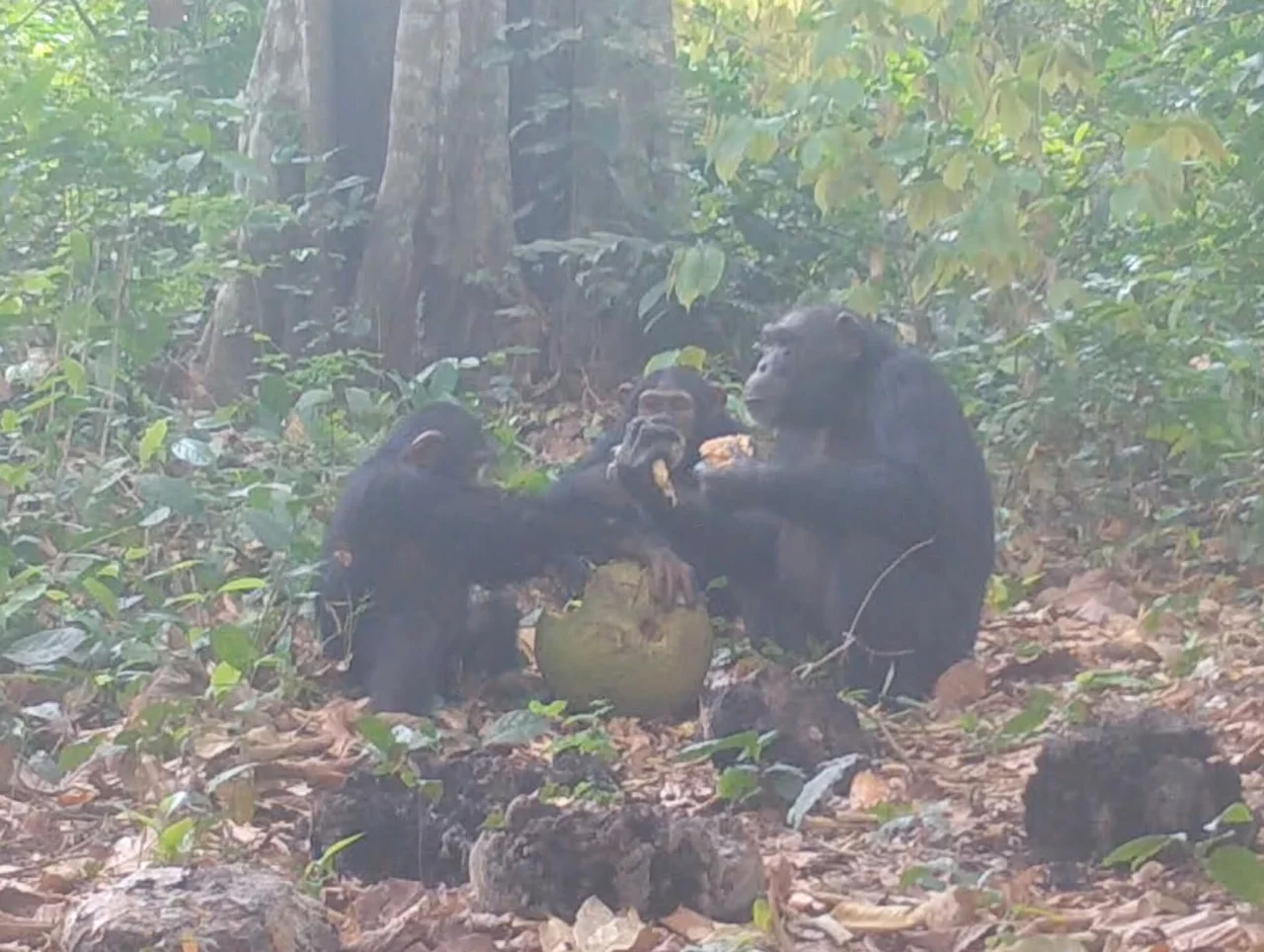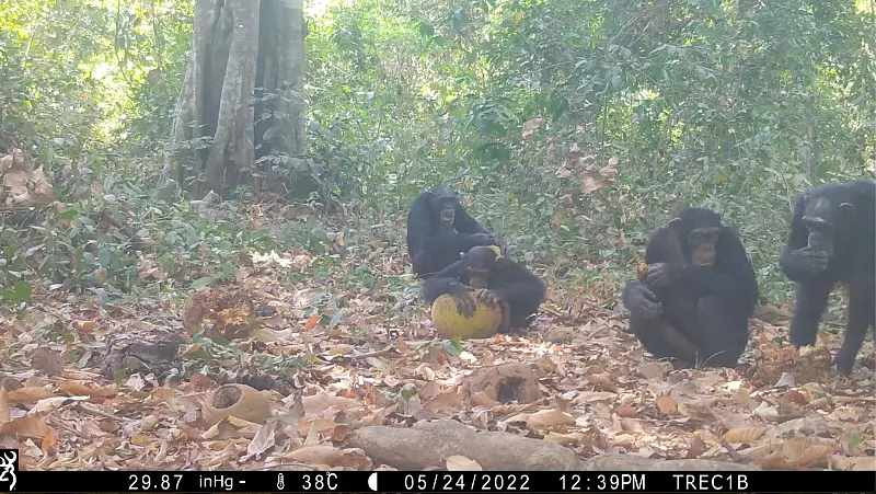 Mit Kamerafallen zeichnete die Gruppe insgesamt 70 Ereignisse auf, bei denen Schimpansen (Pan troglodytes) die Früchte verzehrten. Bei 9 von jenen 10 Beobachtungen, bei denen die Menschenaffen diese Nahrung teilten, enthielten die Früchte Alkohol. Beteiligt waren Schimpansen beiderlei Geschlechts und verschiedener Altersgruppen. «Unsere Daten liefern den ersten Beleg für das Teilen von alkoholhaltiger Nahrung durch Menschenaffen», schreibt die Gruppe im Fachjournal «Current Biology».