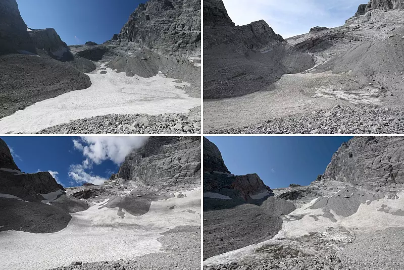 Auf den Bildern der vergangenen Jahre ist der Schwund des Gletschereises unterschiedlich gut zu erkennen – je nachdem, wie viel Schnee aus der jeweiligen Saison noch am Gletscher liegt.