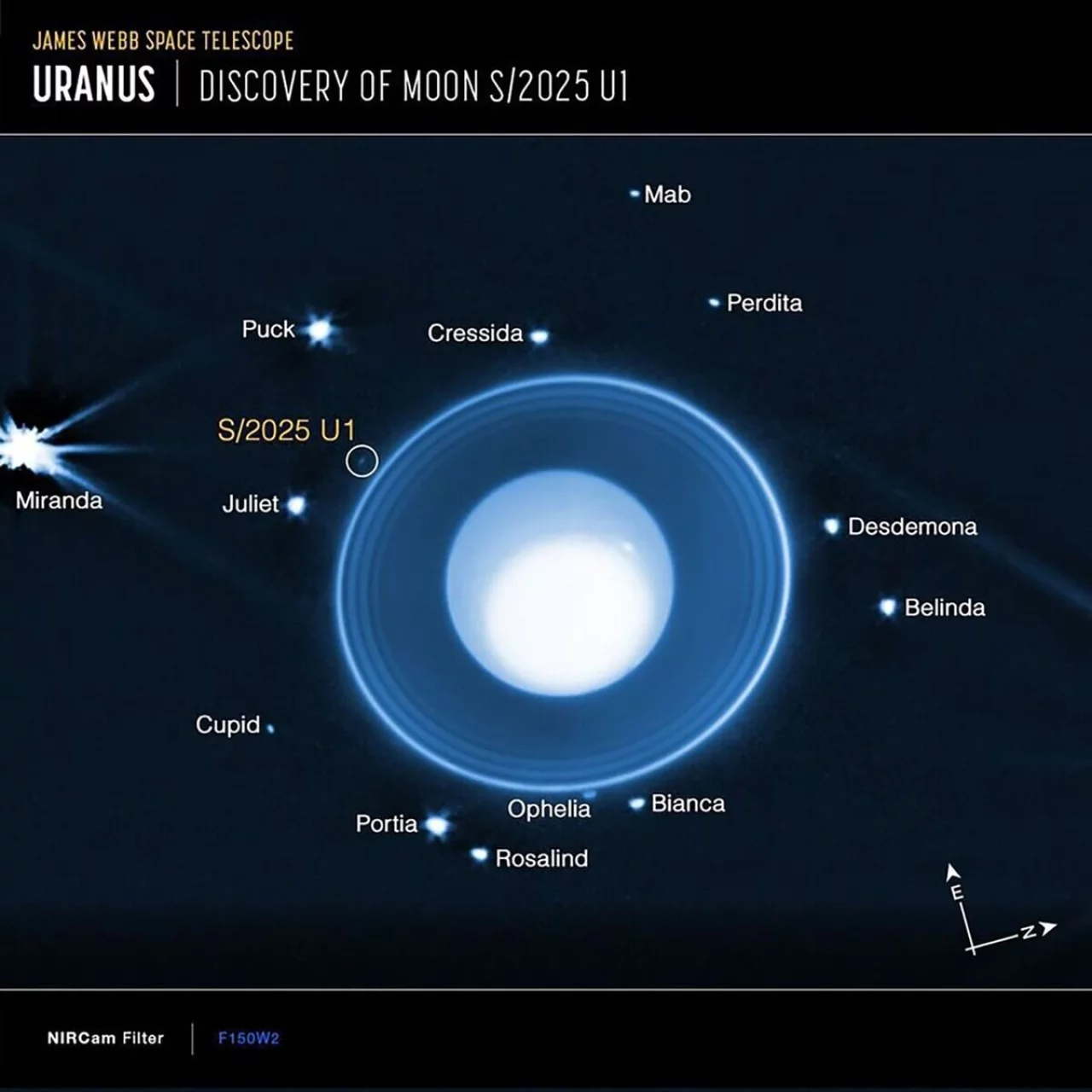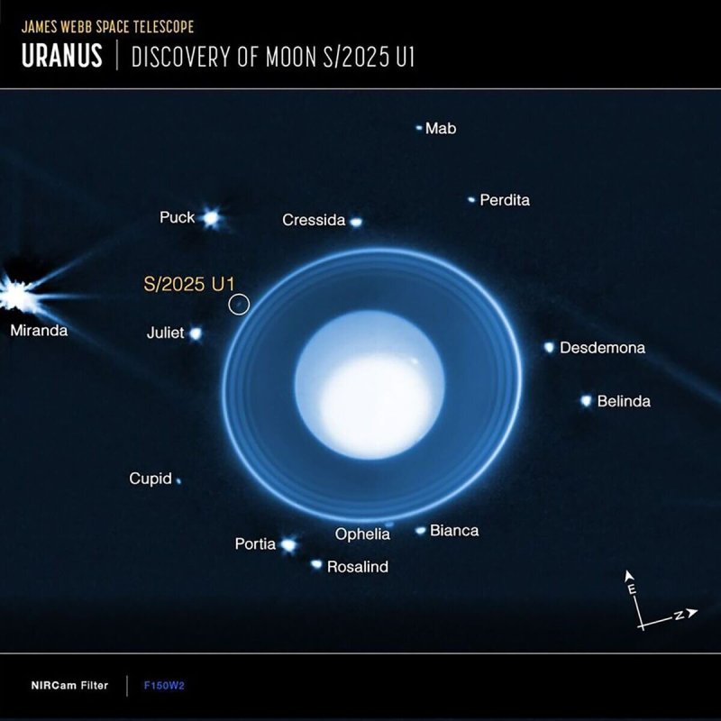 Astronomen haben mit Hilfe des James-Webb-Weltraumteleskops einen neuen Mond des Planeten Uranus entdeckt. Der Himmelskörper mit der vorläufigen Bezeichnung S/2025 U1 erweitert die Zahl der bislang bekannten Uranus-Monde auf 29, wie die US-Raumfahrtbehörde Nasa mitteilt.