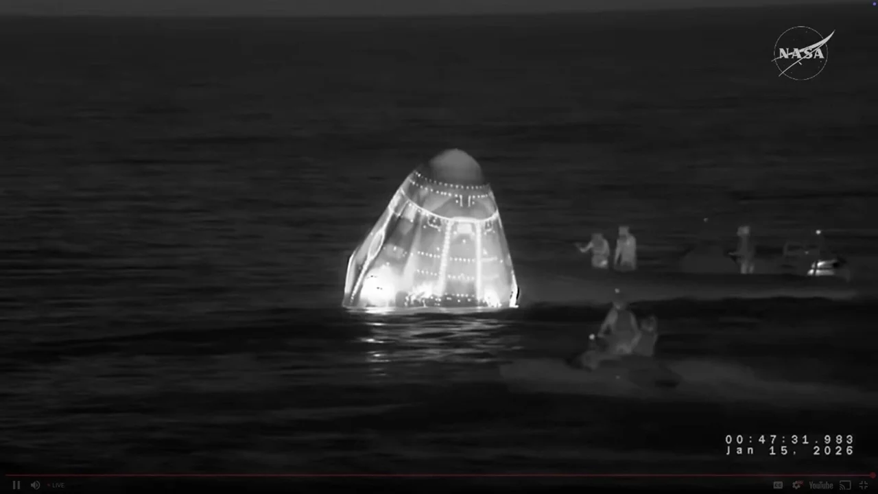 Die SpaceX Crew-11-Mitglieder landeten mitten in der Nacht in der Nähe von San Diego im Meer. - © Uncredited/NASA/AP/dpa